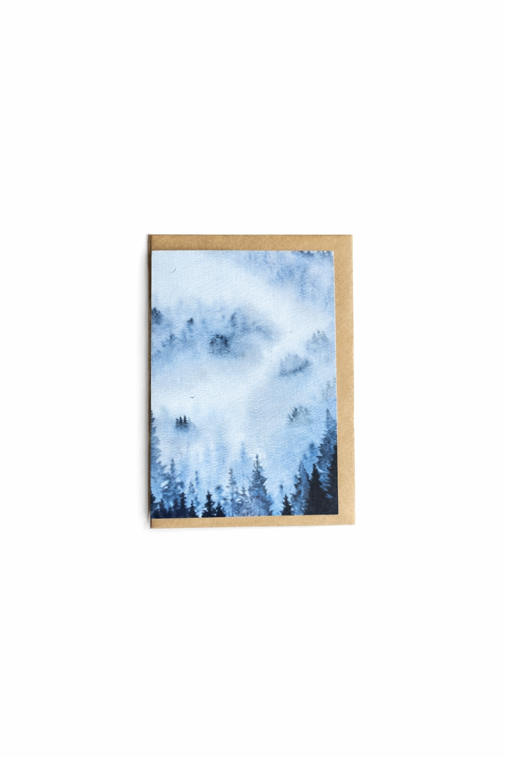 This design captures a quiet forest emerging through cool blue mist, inspired by still mornings and breath-held moments.